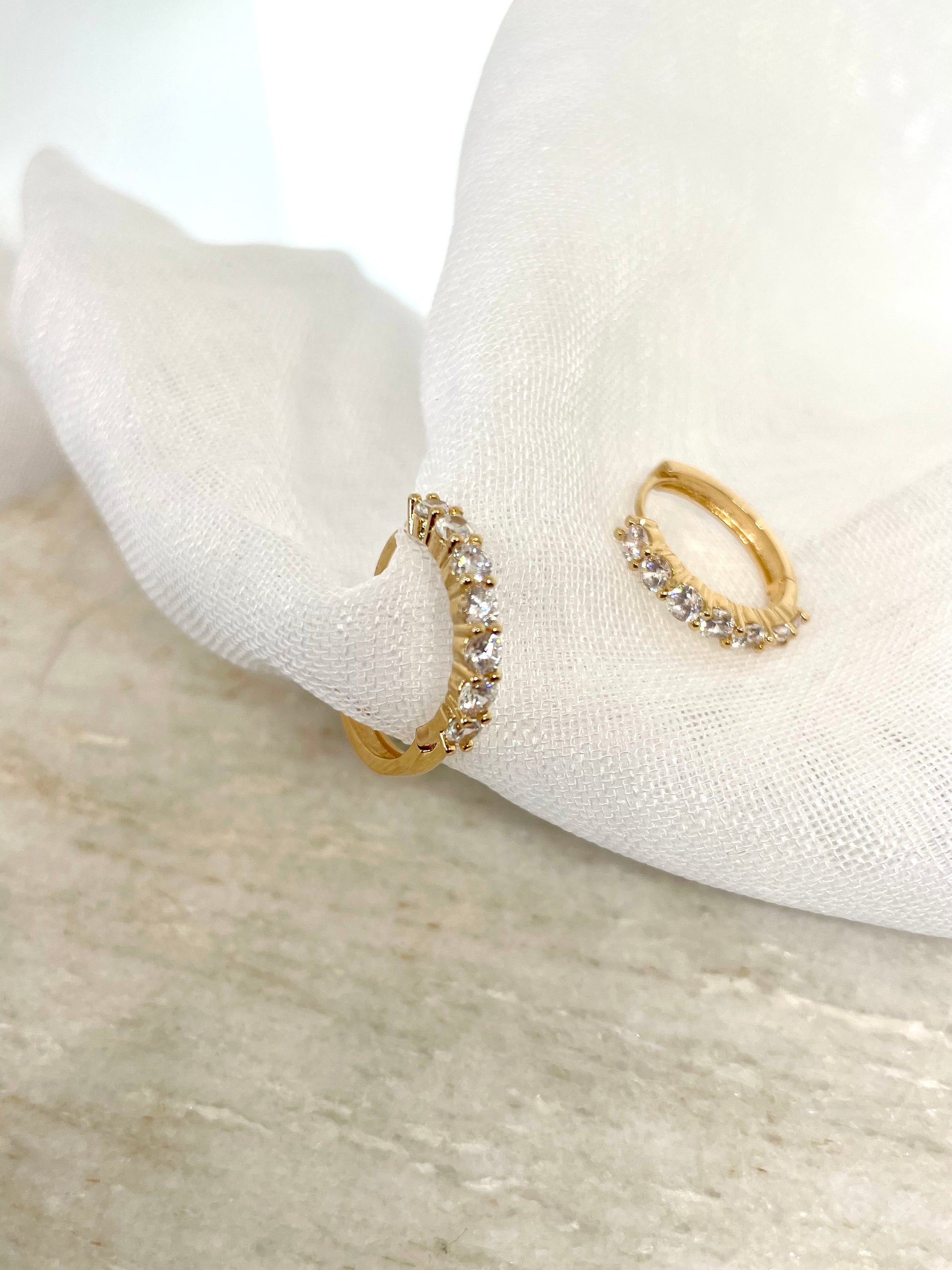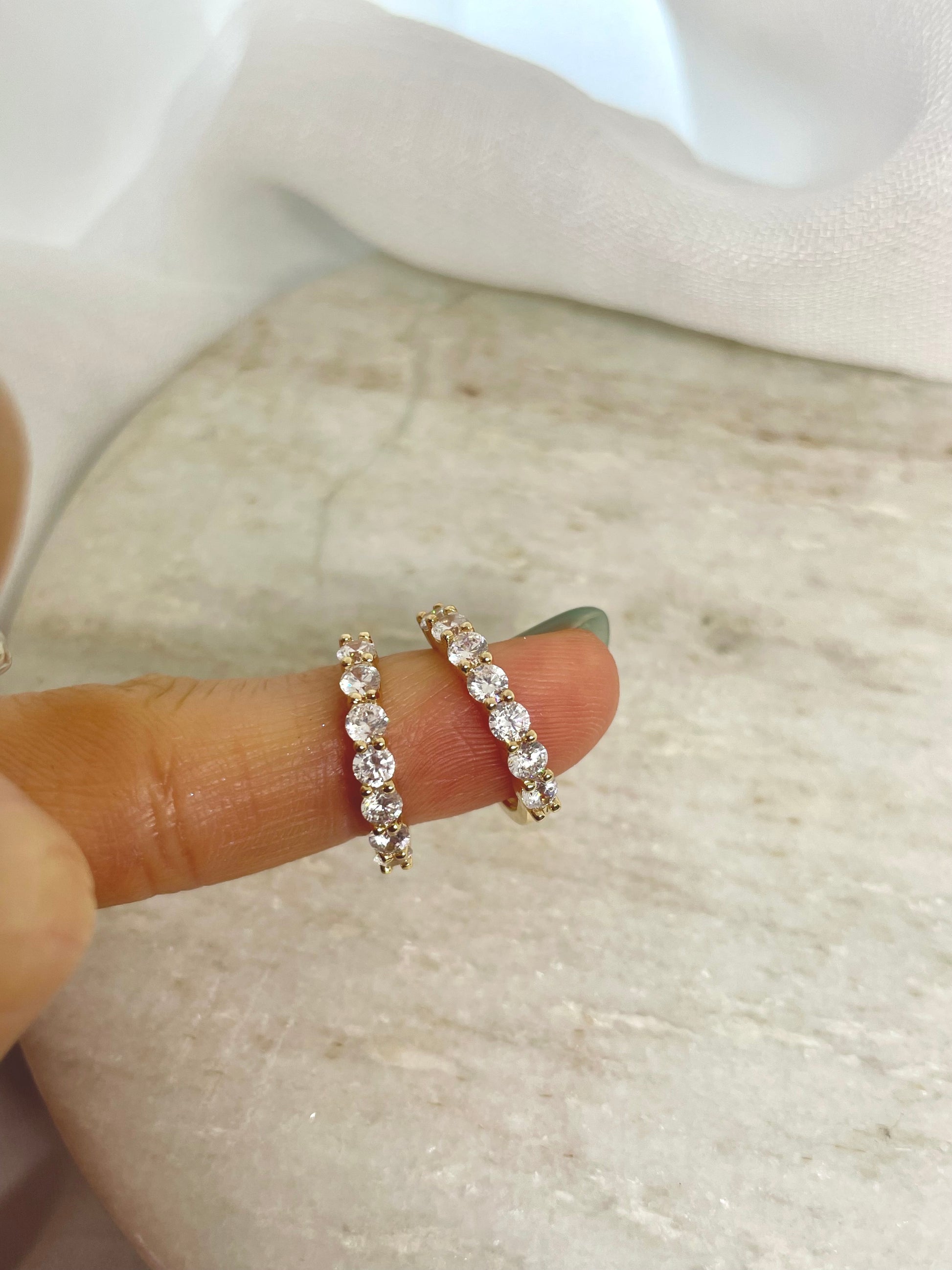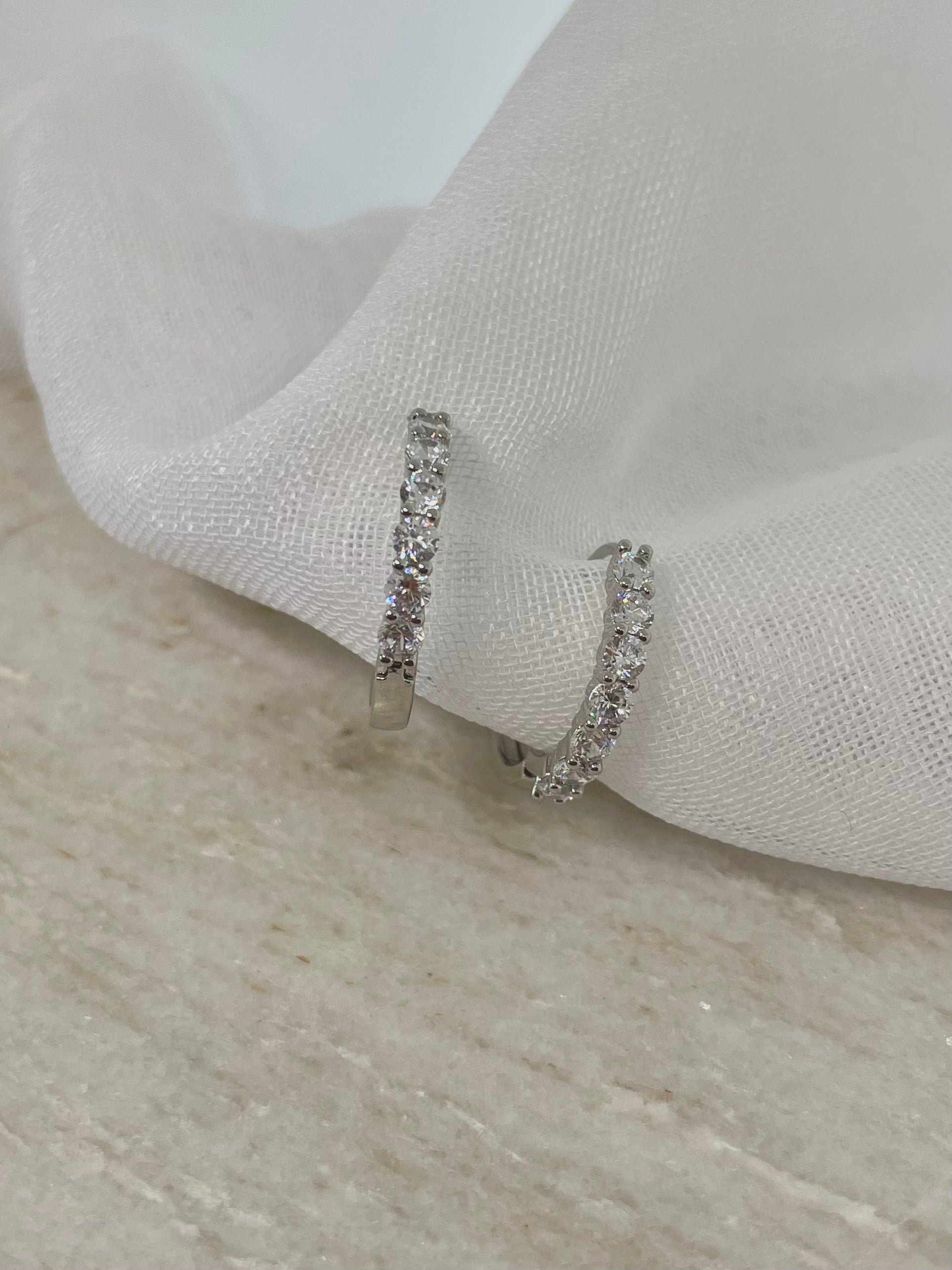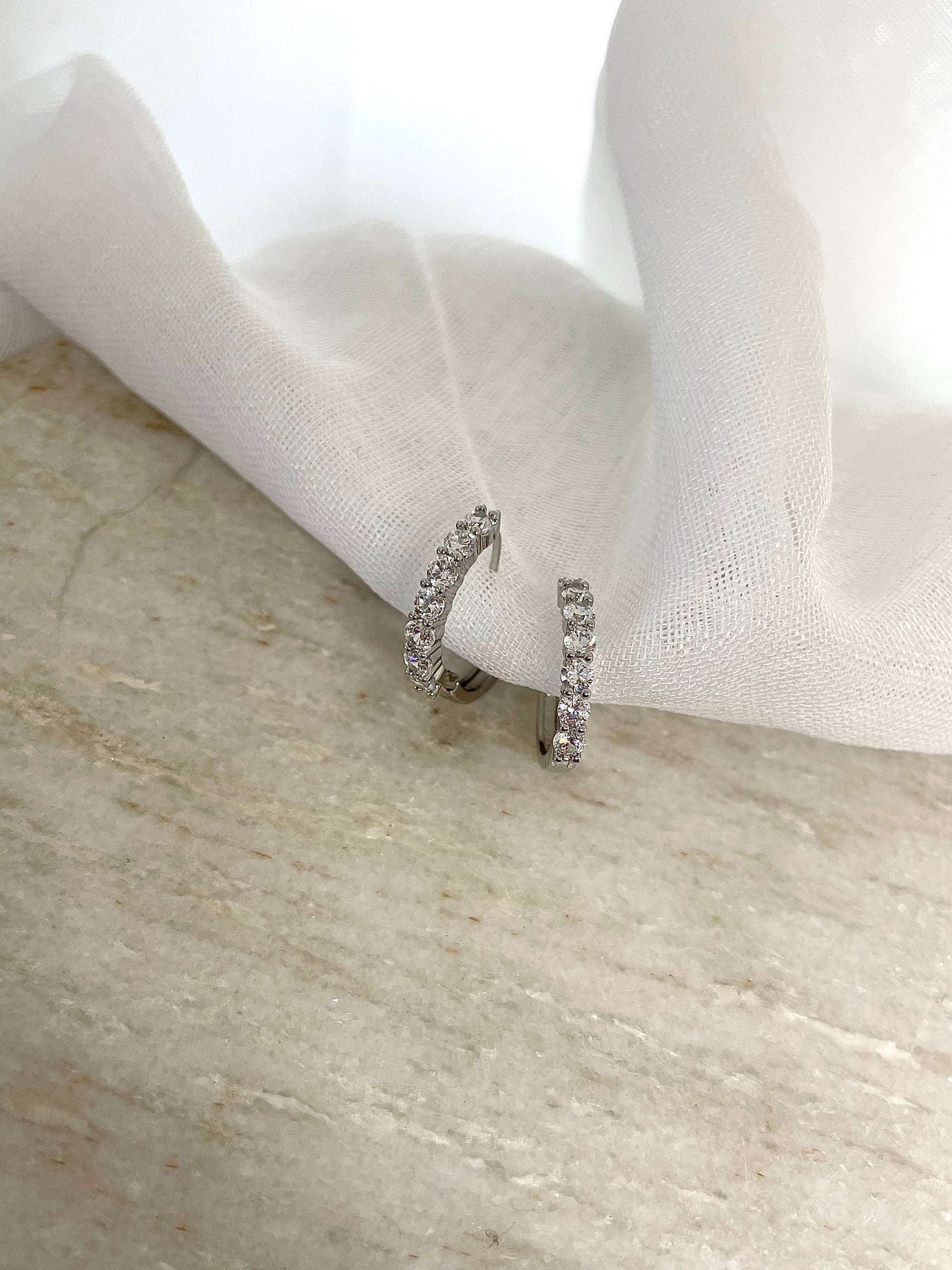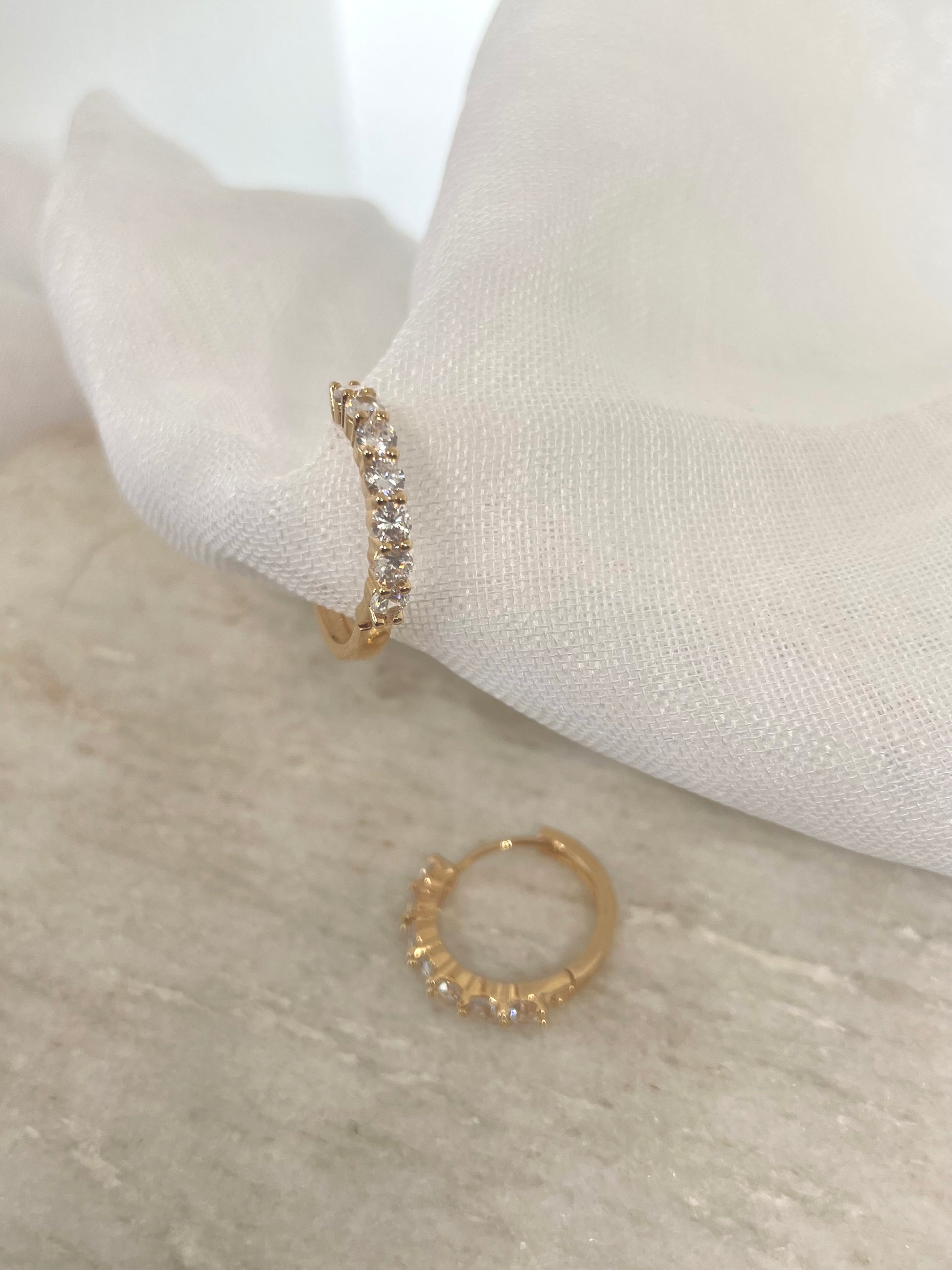 These timeless huggie earrings sparkle with a row of glittering cubic zirconia and come in your choice of gold or silver.