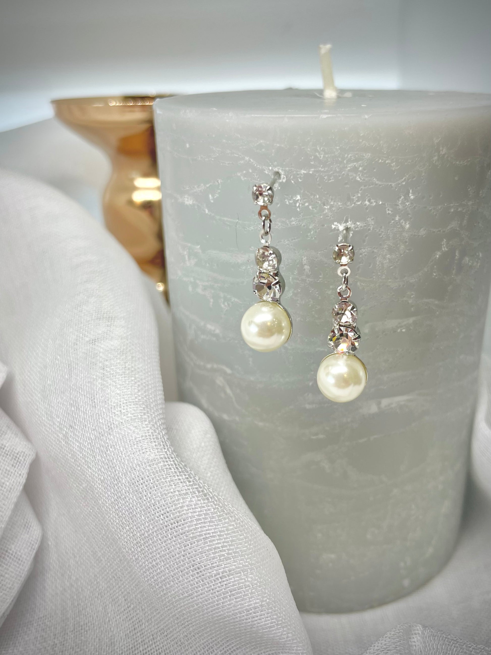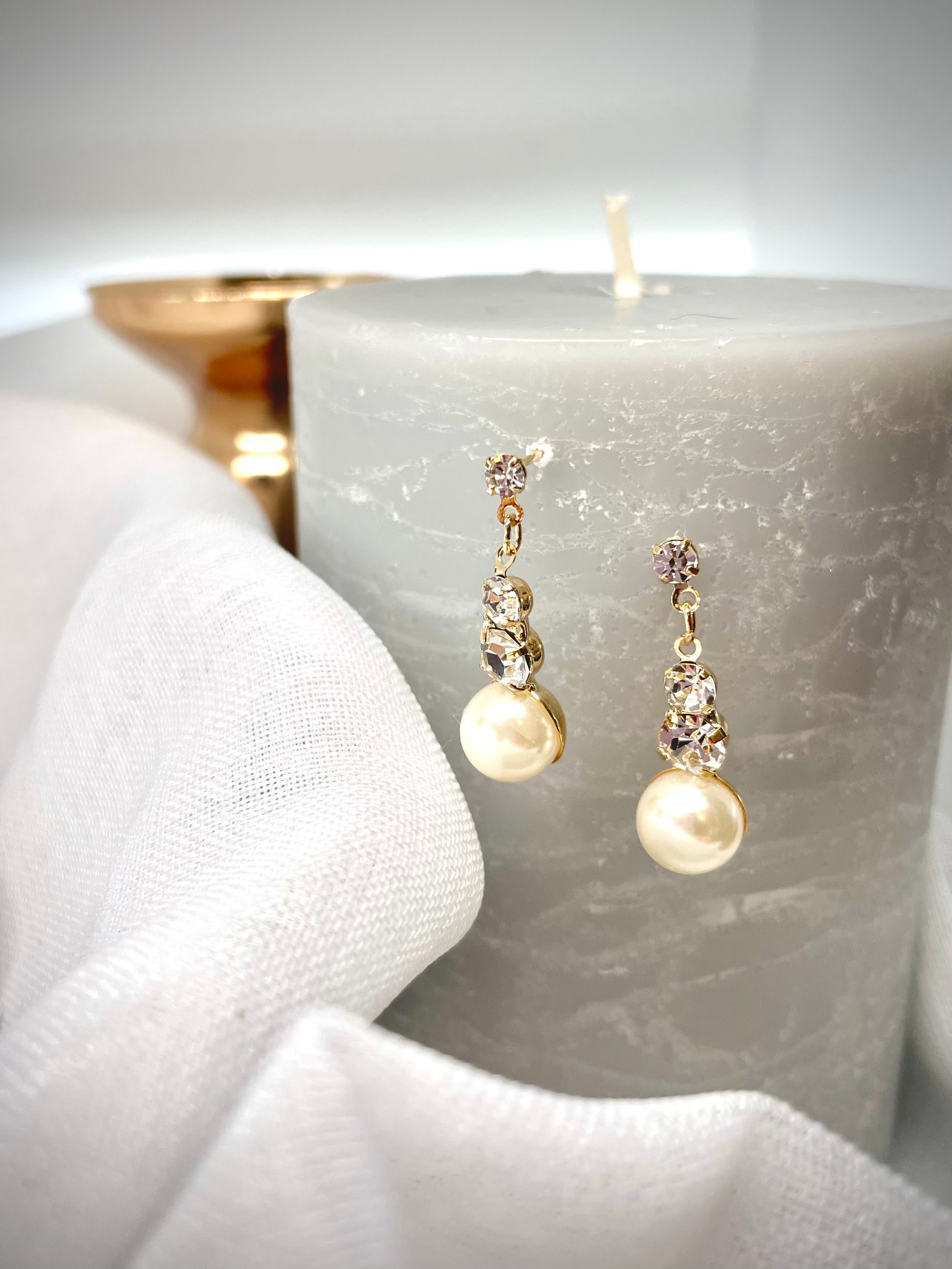 Sophisticated drop earrings featuring shimmering cubic zirconia complemented by a classic pearl finish. Available in elegant gold and silver options.