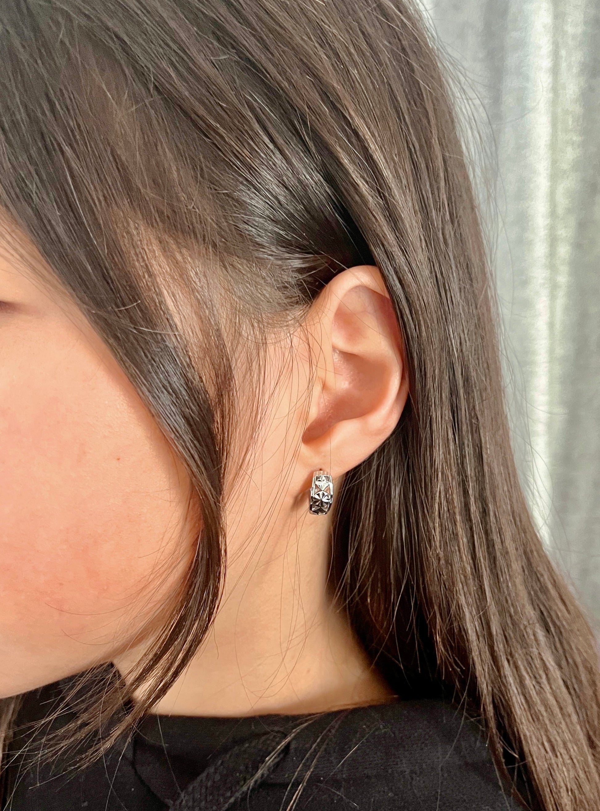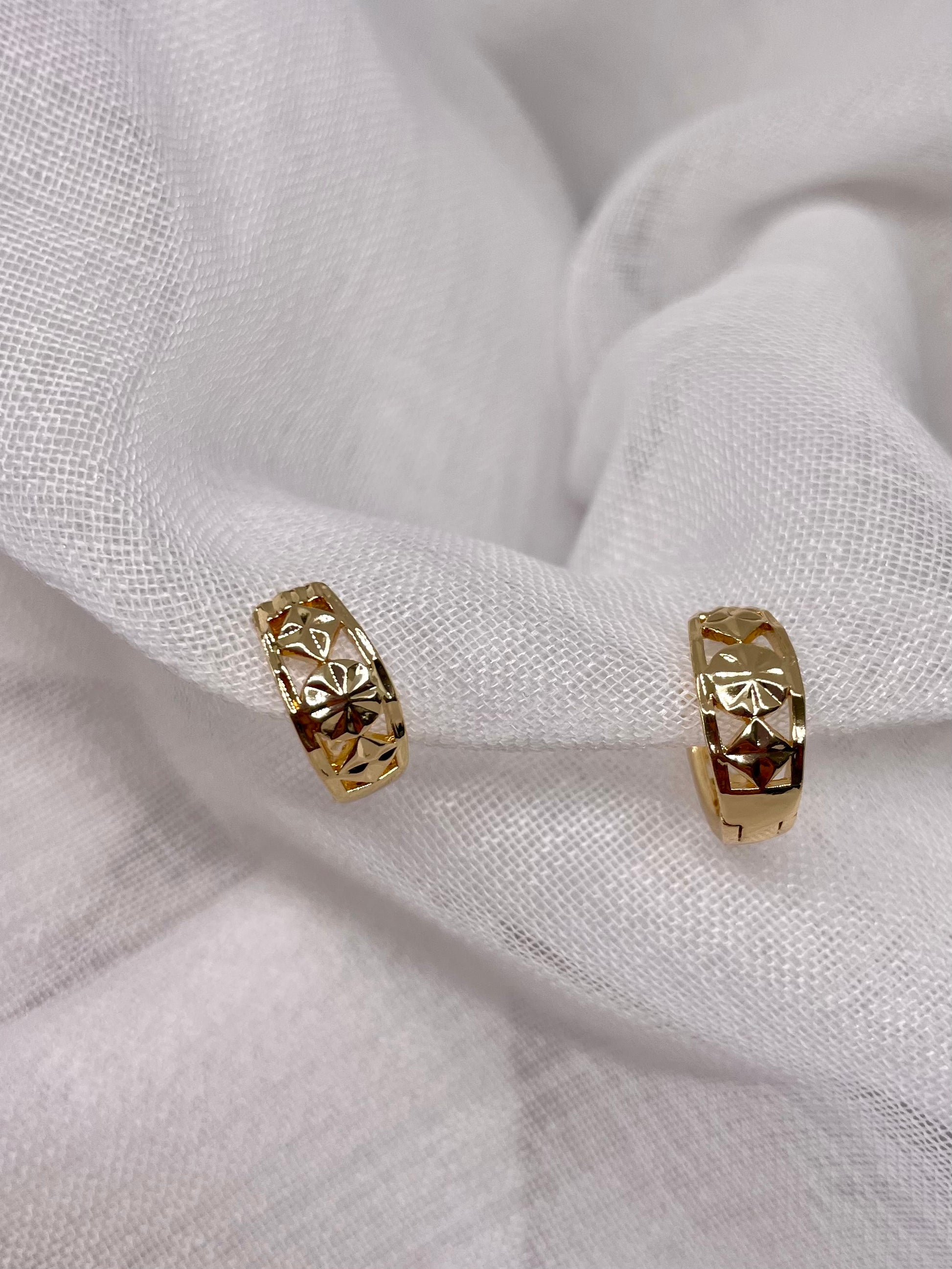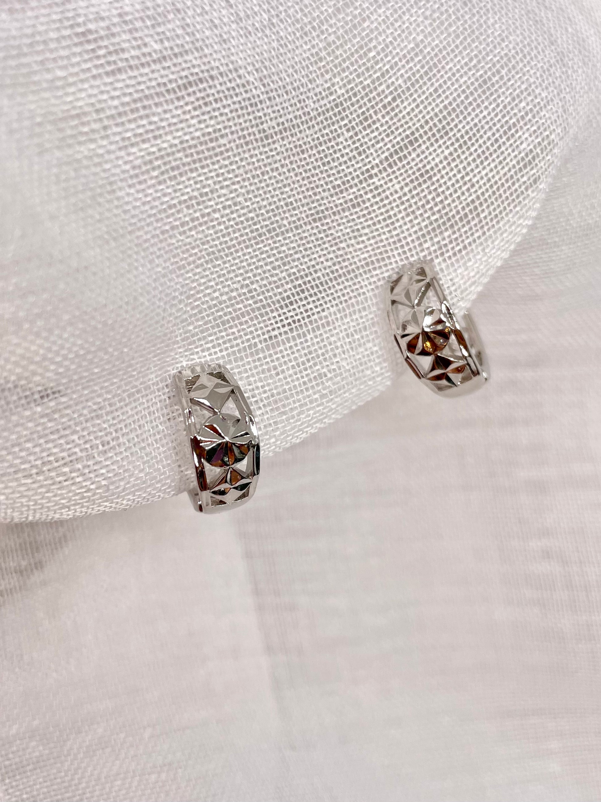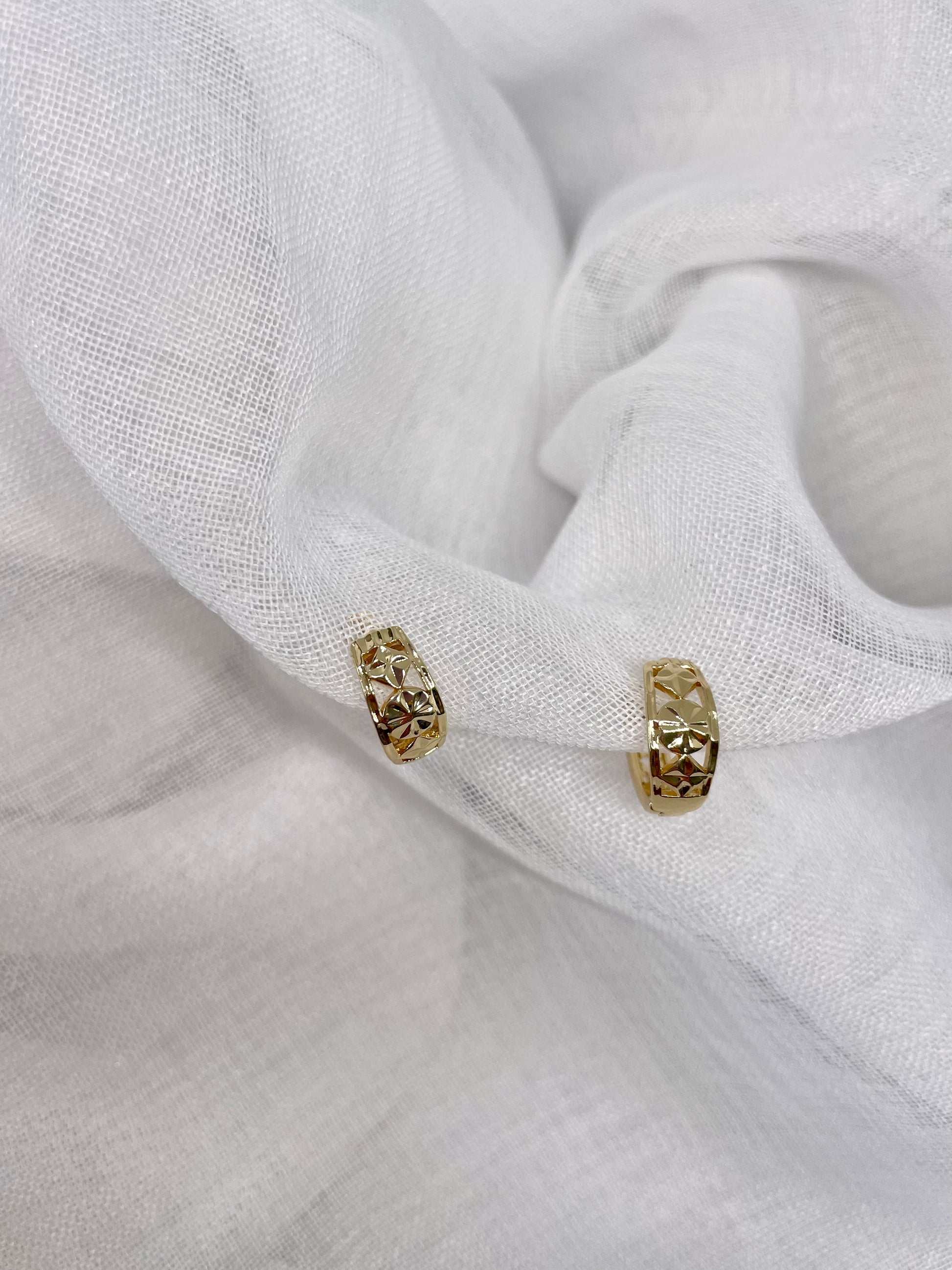 Delightful huggie earrings featuring intricate engraved floral designs, offered in elegant gold and silver finishes.